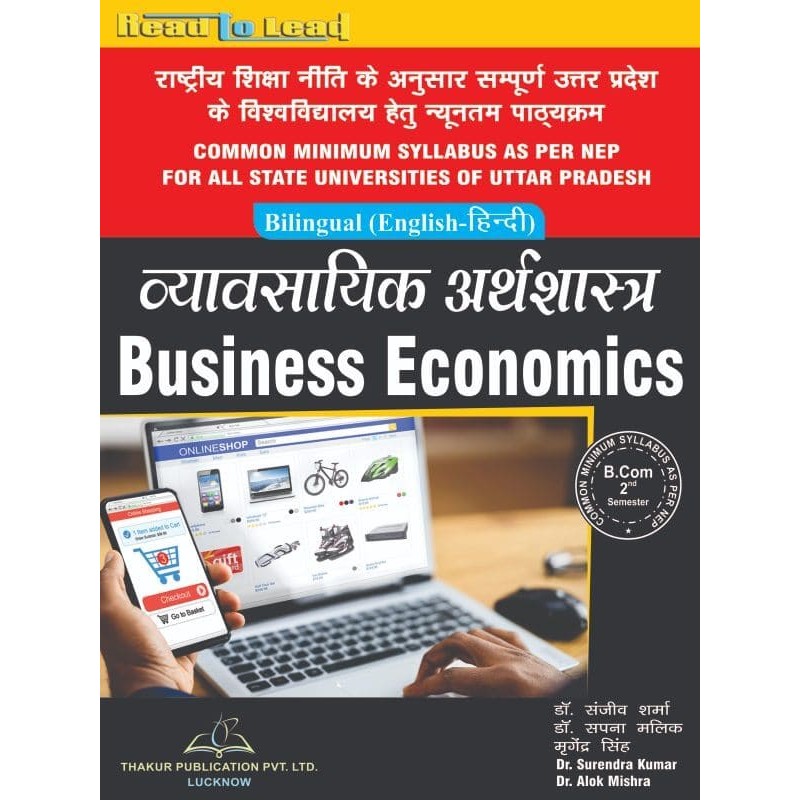 Business Economics: Book for UP B.COM 2nd semester in Bilingual. The book is published by Thakur Publication Pvt. Ltd. and is suitable for students enrolled in Purvanchal University Jaunpur, Chaudhary Charan Singh University Meerut, Bheem Rao Ambedkar University Agra, Mahatma Gandhi Kasha Vidyapeeth Varanasi, Deen Dayal Upadhyay University Gorakhpur, Rajju Bhaiyya State University Prayagraj, Rohilkhand University, and Bareilly.