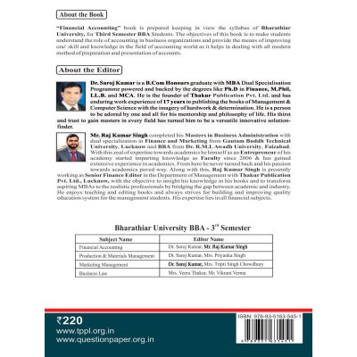 Bharathiar University, BBA 3rd Third SemesterSyllabus FINANCIAL ACCOUNTING Unit-IBasic Accounting Concepts - Kinds of Accounts. Double Entry Book Keeping – Rules of Double Entry System – Preparation of Journal and Ledger Accounts- Problems - Subsidiary Books - Cash Book – Types of Cash Book - Problems - Purchase Book - Sales Book - Sales Return and Purchase Return Books. Unit-IITrial Balance - Errors – Types of Errors - Rectification of Errors – Problems - Bank Reconciliation Statement – Problems. Unit-IIIManufacturing - Trading - Profit & Loss Account - Balance Sheet. Problems with Simple Adjustments. Unit-IVAccounting for Non-Trading Institutions-Income & Expenditure Account- Receipts and Payment Accounts and Balance Sheet - Accounting for Depreciation – Methods of Depreciation – Problems (Straight Line Method and Written Down Value Method Only). Unit-VPreparation of Accounts from incomplete Records. (Theory and Problems may be in the ratio of 20% and 80%respectively)