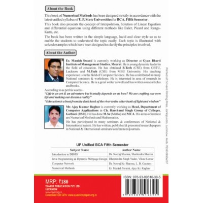 BCA, Fifth Semester, According to ‘UP Unified Syllabus’Syllabus BCA-S304: NUMERICAL METHODS Unit-IRoots of EquationsBisections Method, False Position Method,Newton’s Raphson Method, Rate of Convergence of Newton’s Method. Unit-IIInterpolation and ExtrapolationFinite Differences, The Operator E, Newton’s Forward and Backward Differences, Newton’s Dividend Differences Formulae, Lagrange’s Interpolation Formula for Unequal Intervals, Gauss’s Interpolation Formula, Starling Formula, Bessel’s Formula, Laplace-Everett Formula. Unit-IIINumerical Differentiation Numerical IntegrationIntroduction, Direct Methods, Maxima and Minima of a Tabulated Function, General Quadratic Formula, Trapezoidal Rule, Simpson’s One Third Rule, Simpson’s Three- Eight Rule. Unit-IV Solution of Linear EquationGauss’s Elimination Method and Gauss’s Siedel Iterative Method. Unit-V Solution of Differential EquationsEuler’s Method, Picard’s Method, Fourth-Order Ranga-Kutta Method.