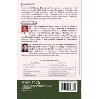BBA UP Unified Syllabus (UP State Universities), Fifth SemesterSyllabusUnit-I Basic Concept – Income, Agriculture Income, Casual Income, Assessment Year, Previous Year, Gross Total Income, Total Income, Person, Tax Evasion, Avoidance and Tax Planning. Unit-IIBasis of Charge – Scope of Total Income, Residence and Tax Liability, Income which does not form part of Total Income. Unit-IIIHeads of Income – Income from Salaries, Income from House Properties. Unit-IVHeads of Income – Profit and Gains of Business or Profession, Including Provisions relating to Specific Business, Capital Gains, Income from Other Sources. Unit-VAggregation of Income, Set-Off and Carry Forward of Losses, Deduction from Gross Total Income.