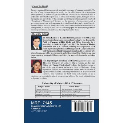 BBA University of Madras, First SemesterSyllabus PRINCIPLES OF MANAGEMENT Unit-IManagement: Importance – Definition – Nature and Scope of Management Process – Role and Functions of a Manager – Levels of Management – Development of Scientific Management and Other Schools of thought and Approaches. Unit-IIPlanning: Nature – Importance – Forms – Types – Steps in Planning – Objectives – Policies – Procedures and Methods – Natures and Types of Policies – Decision-Making – Process of Decision-Making – Types of Decision. Unit-IIIOrganizing: Types of Organisations – Organisation Structure – Span of Control and Committees –Departmentalisation – Informal Organisation – Authority – Delegation – Decentralisation – Difference between Authority and Power – Responsibility Unit-VIRecruitment – Sources, Selection, Training – Direction – Nature and Purpose. Coordination – Need, Type and Techniques and Requisites for Excellent Coordination – Controlling – Meaning and Importance – Control Process. Unit-VDefinition of Business Ethics – Types of Ethical Issues – Role – and Importance of Business Ethics and Values in Business – Ethics internal – Ethics External – Environment Protection – Responsibilities of Business.