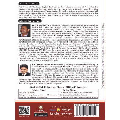 MBA, Semester - IVAccording to the new syllabus of ‘Barkatullah University, Bhopal’SyllabusCP-402: Business Legislation Max. Marks: 80 Min. Pass Marks: 32 Unit-IAn Overview of Laws related to Promotion and Incorporation of Different Types of Companies. Unit-IILaws Related to Contract with Special reference to its Performance, Breach and Remedies. Unit-IIIConsumer Protection Laws and Rights of Consumers. Unit-IV Basic Provisions of Pollution Control, Environment Protection and Intellectual Property Rights. Unit-VLaws related to Mergers & Acquisitions in View of the Multinational Companies Operating in India.