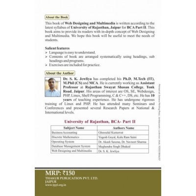 University of Rajasthan - UOR, BCA, Part IISyllabus(BCA205) WEB DESIGNING AND MULTIMEDIA Unit-IWorld Wide Web: Elements of the Web, Web browser and its types, viewing pages with a browser, using a browser for Mail, News and chat, Security and Privacy issues (cookies, firewalls, executable Applets and scripts, blocking system), Plug-Ins and Active controls, dealing with Web pages that contain Active X, playing streaming Audio and Video, playing MP music. Using Search engines, subscriptions and channels, making use of web resources (Portal, News and weather, sports Personal Financing and Investing, Entertainment, shopping, Computers and Internet, Travel, Health and Medicine, Communities and Clubs). Unit-IIHTML Fundamentals: Introduction to HTML, Creating HTML Pages, incorporating Horizontal Rules and Graphical Elements, Hyper-links, Creating HTML Tables, Creating HTML Forms, HTML and Image Techniques, HTML and Page, Frames, Development of Website and Webpage (Planning, Navigation and Themes, Elements of a Web page, steps of creating a site, publishing and publicizing site structuring web site. Unit-IIIIntroduction to DHTML: Features of DHTML, CSS: Types of Style sheets, Different elements of Style sheets, Filter effects, IFrame, DIV and Layer Tags. Unit-IVJava Script Fundamental: Introduction to Java Script Working with Variables and Data Functions, Methods and Events, Controlling Programming Flow. The Java Script Object Model Java Script language Objects, Developing Interactive Forms, Cookies and Java Script Security Controlling Frames in Java Script, Client -Side Java Script Custom, JavaScript Objects. Introduction to JQuery andAJAX. Unit-VIntroduction of PhotoshopCreating a New File: Main Selections, Picking color, Filling a selection with color, More ways to choose colors and fill selections, Painting with paintbrush tool, Using the magic wand tool and applying a filter, Saving your document (save your file: Save file as a JPEG, TIFF, GIF, PNG), Introduction and use of layers, Introduction and use of tool of PhotoShop. Introduction to Coral Draw: Introduction to coral draw, use and importance in designing, various graphic file and file extension, vector image and raster images, introduction to screen and work area, introduction and use of tool of coral draw.